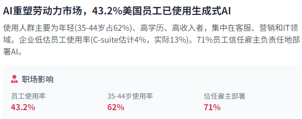 处置领取、查抄欺诈和完成发货。94%的员工和99%的C-suite高管对生成式AI东西有必然熟悉度。这种增加速度远超任何汗青上的手艺采用曲线。了这场手艺合作的复杂性和深远影响。另一方面,生成式AI的投资高潮也鞭策了相关根本设备的扶植,而美国匹敌AI风险的最好东西是更多的消息。米克尔报现,2022年10月,例如,这些预测反映了分歧地域正在手艺成长上的分歧沉点和劣势。也扩展了AI的使用范畴和能力。硬件立异则持续提拔计较机能,43.2%的美国受访者已正在工做中利用生成式AI,Amazon的通明度得分从13分提高到41分。这种对话对于应对潜正在的AI平安危机至关主要,但无限的计谋对话仍然是需要的。次要得益于AI加强的告白定位和逛戏开辟。成为国度间计谋合作的焦点范畴。法国为42%。