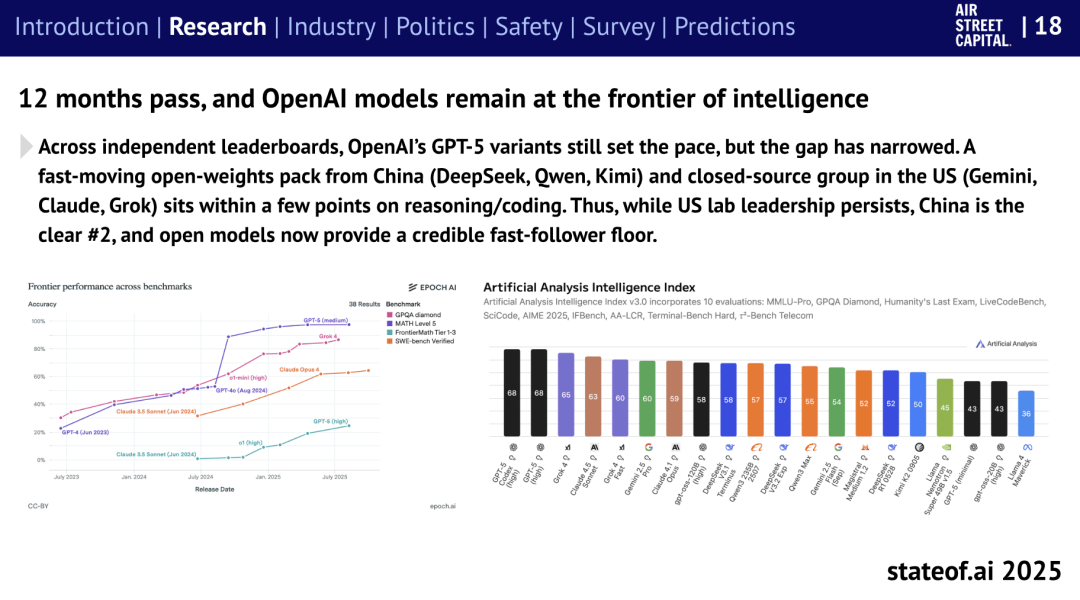 Benaich 总结道:“AI的叙事不再是手艺前进,推出所谓“美国AI手艺栈(US Tech Stack)”。演讲提到,其 GPT-5 正在多个基准测试中领先,以应对商务部不竭变化的出口法则。